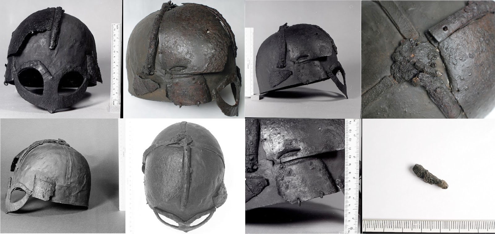 Em segundo lugar, há publicações sobre fragmentos de pelo menos 5 outros elmos espalhados pela Escandinávia e também em áreas com forte influência escandinava (veja o artigo Elmos Escandinavos do Século X [em inglês]). Estou ciente de vários achados e interpretações não publicadas cujas autenticidades não podem ser comprovadas, especialmente os fragmentos de elmos encontrados em Tjele, na Dinamarca, que são muito próximos ao elmo de Gjermundbu, uma vez que consistem em uma máscara e oito faixas estreitas de metal de 1 cm de largura (veja o artigo O Elmo de Tjele [em inglês]). Baseado nos fragmentos do elmo de Gjermundbu, nos fragmentos do elmo de Tjele e na máscara de Kyiv (o formato original do fragmento de Lokrume é desconhecido), podemos dizer que o tipo de elmo “spectacle helmet” (algo como elmo com máscara ocular em português) claramente evoluiu dos elmos da Era Vendel e foi o tipo predominante de elmo escandinavo até próximo de 1000 A.D., quando os elmos cônicos com nasais tornaram-se populares.